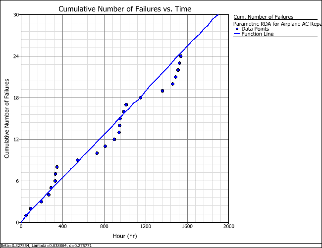 The LK value for the Type I model is -123.6347 while the LK value for the Type II model is -123.5964. Therefore, for this data set, the Type II model may provide the best fit (i.e., have a slightly larger LK value). The parameters of the Type II GRP model are estimated to be beta = 0.8276, lambda = 0.0389 and q = 0.2758. - Click the Plot icon to visualize how the number of failures increases over time, as shown next.