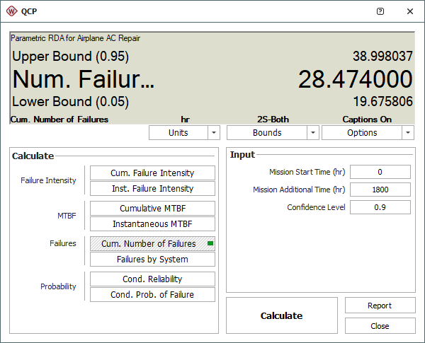 - Click Calculate. The results show that the cumulative number of failures in 1,800 hours is 28.4740 or about 28 failures, and the number may be as high as about 39 failures.