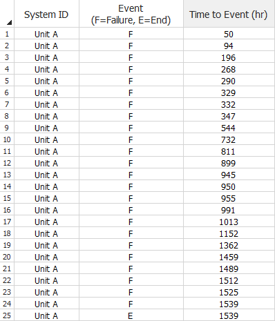 The data set used in this example is available in the example database installed with the Weibull++ software (called "Weibull26_Examples.rsgz26"). To access this database file, choose File > Help, click Open Examples Folder, then browse for the file in the Weibull sub-folder.