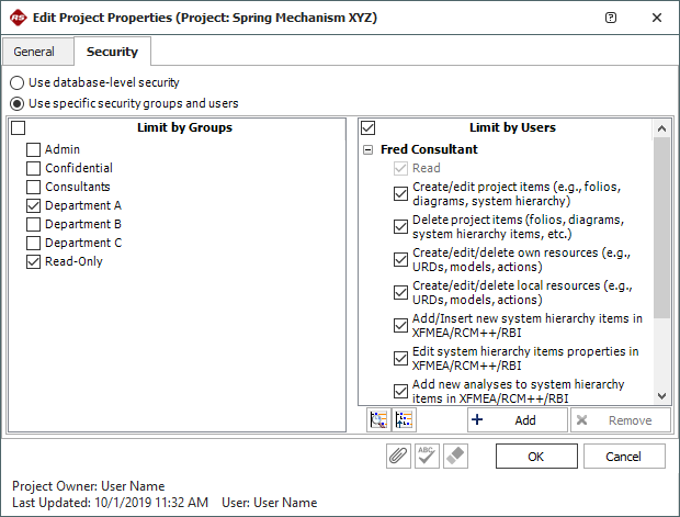 5. For the example shown below, users from Department A will have read/write access (because they belong to the "Department A" security group), users from Departments B and C will have read-only access (because they belong to the "Read-Only" security group) and Fred Consultant will have read/write access (because he belongs to the "Consultants" security group and has been specifically assigned to have those permissions in this project).