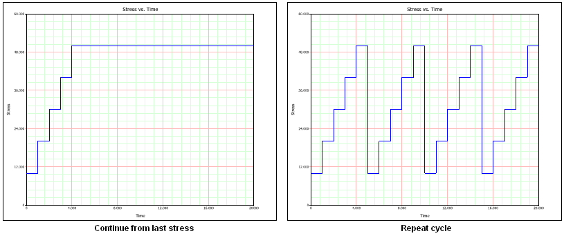 For example, suppose you defined a stress pattern that is made up of five segments, each an hour long and increasing stepwise from the segment before. The graphs below illustrate the difference between continuing from the last stress (left) and selecting to repeat (right). In this example, the test has a duration of 20 hours, and the graphs explain what would happen through the entire duration of the test.