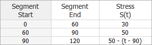 - Stress S(t), Throughput T(t), Cost C(t) or Duration D(t) is the value or function for the segment. If the stress, throughput level, cost or duration will stay constant during a segment, enter a constant value (e.g., 30). If the value will change during a segment, enter it as a function of time (e.g., at time = 20, the function t + 20 will return a value of 40). When entering a function, you must use t or T as the time variable.