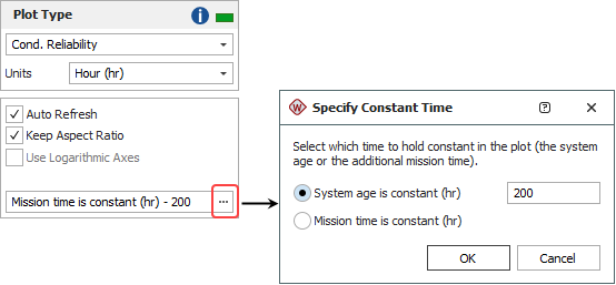 If you choose to hold mission time constant, the plots will show the reliability/unreliability for different system ages. For example, assuming that the mission will be 100 hours, the plot can show the reliability for a system that has already operated for 10 hours, 20 hours, 30 hours, etc.