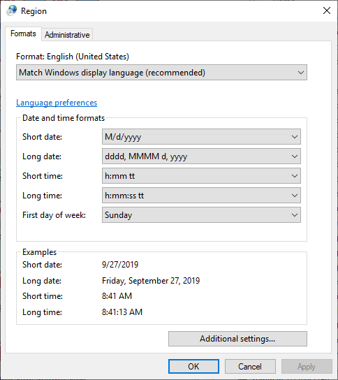 When you first install the software, it will check your computer's current language as it is set in the Format field in the Windows Region and Language window. If that language is supported in the ReliaSoft applications, they will use those settings; however, if that language is not supported, they will use the default setting of English.