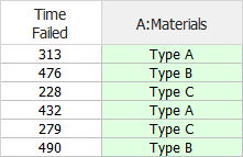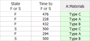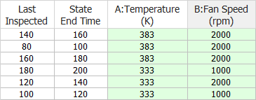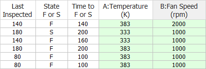 - Life Data with Intervals: Interval censored data sets contain uncertainty as to when the units actually failed. For example, if five units under test are inspected every 100 hours, then the status of each unit (failed or still running) is known only at the time of each inspection. If a unit fails, it is known only that it failed between inspections and the exact time of failure is not known. Instead of an exact failure time, an interval of time (e.g., between 0 and 100 hours, or 100 and 200 hours) would be recorded. Interval data are shown next in the context of a factorial reliability design (e.g., the first data point indicates that a failure occurred at some time between 140 and 160 hours).