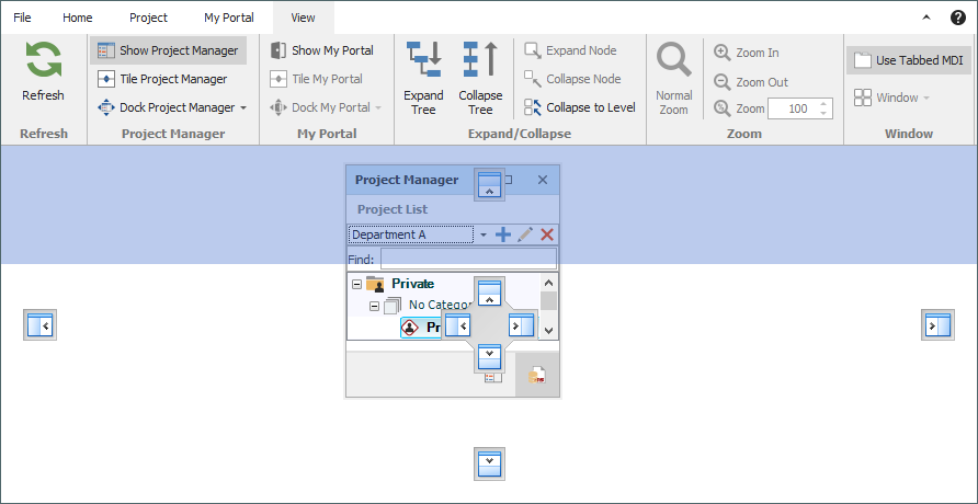 As an example, the following picture shows the Project Manager panel docked on the left side of the MDI, unpinned and hidden, while the My Portal panel is docked on the right side of the MDI, unpinned and visible (either because the user moved the pointer over or clicked the tab).