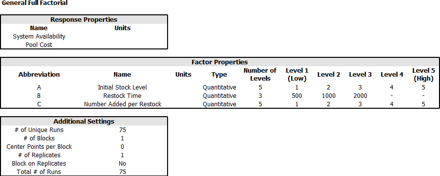 The experiment used in our example is a general full factorial design using the following settings: