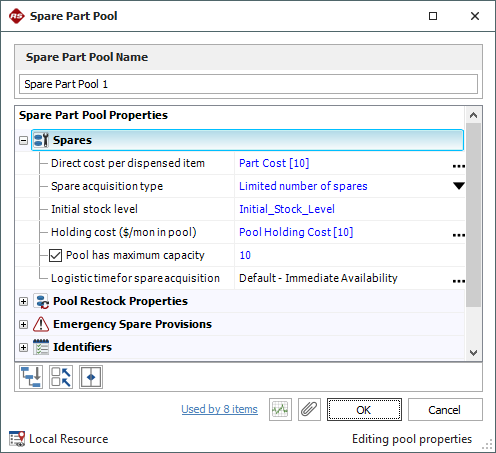The spare part pool that is used by the tasks in our example is configured as shown next. The cost per item is specified as a constant model equal to $10 and the holding cost is specified as a constant model equal to $10 per month. Since the factors of interest (i.e., the initial stock level, the frequency of restocking and the number added per restock) will not be held constant, they are assigned to variables. These variables represent factor values that will be specified in the simulation worksheet.