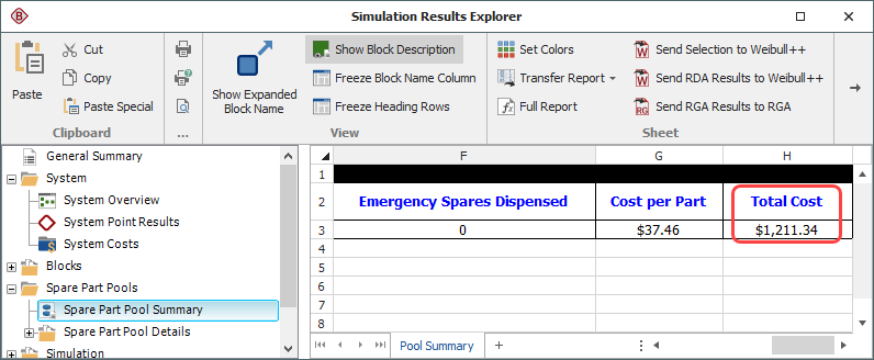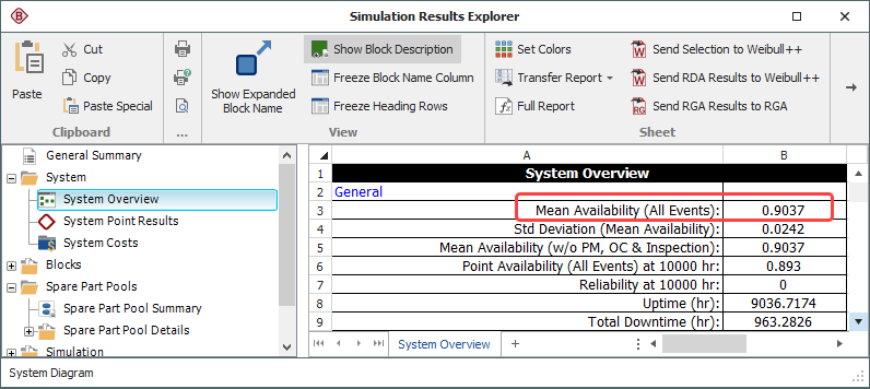 The simulation results from BlockSim are shown next. The results show a mean system availability of 0.904 and a total cost for the pool of $1212.55. These values are very close to the estimated values in Weibull++.