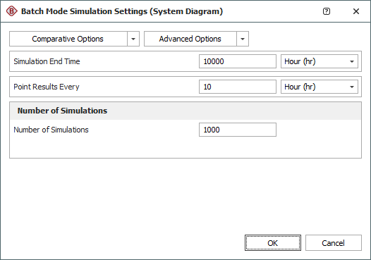 - Click the Edit Simulation Settings button to open the Batch Mode Simulation Settings window. This is an abbreviated version of the Maintainability/Availability Simulation window or of the Flowchart Simulation window, depending on whether the associated diagram is a simulation RBD or an event analysis flowchart. The settings that you specify will apply to the simulation performed for each row (i.e., each factor setting combination). Specify the desired simulation settings and click OK to return to the Worksheet Simulation window.