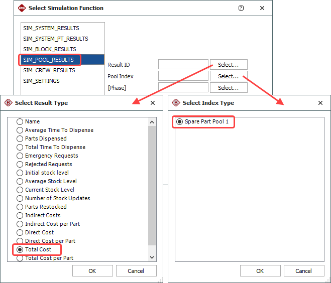 - If the associated diagram is a simulation RBD, define the function to calculate from each simulation. This is done by clicking the cell associated with the result column to open a limited version of the Function Wizard, where only the simulation functions are available.