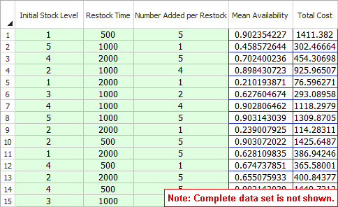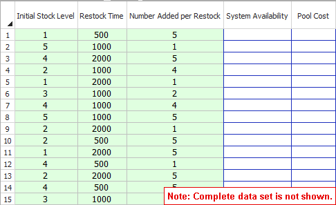 The results of optimization for our example are shown next. A single optimal solution is found with Initial Stock Level = 5, Restock Time = 1151 and Number Added per Restock = 5. This gives a system availability of .907 and pool cost of 1172.