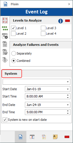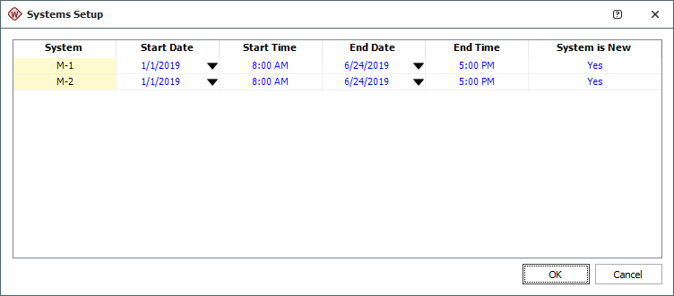 The Systems Setup window is available only if you have selected the Use System column check box on the Other page of the folio’s control panel. This window allows you to record the dates/times when you started and stopped collecting event log data for each system and whether it was new at the specified start date. The information you provide is used by the software to obtain the time to first occurrence of the failure (F) and general (E) events of every unique system.