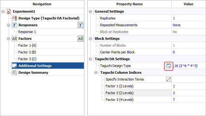 The table can be accessed from the Design tab of the standard design folio while configuring a Taguchi OA factorial design. To open it, click the Additional Settings heading in the navigation panel and then click the View Alias Table icon in the input panel.