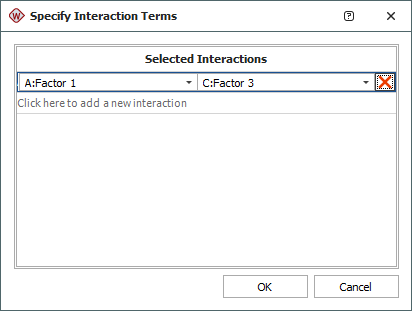 Once you click outside the row, the interaction term (e.g., "A·C") will appear. To remove the term, click inside its row and then click the red X.