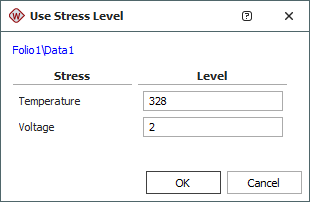 The Stress area of the window lists every stress that will be used in the calculation. In the Use Stress Level area, enter the stress level that the product will experience under normal conditions. For example, to specify that the normal operating temperature for a product is 328 K and the normal operating voltage is 2 V, you would enter the following into the window: