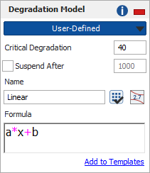 To define a new degradation model, choose User-Defined from the drop-down list in the Degradation Model area. Then enter the model's Name and a Formula that represents the degradation over time. The formula can include parameters with any name (e.g., b or beta), but it should include x as the random variable for time.