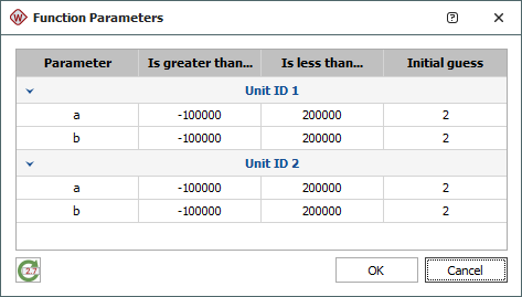 - In the Is greater than and Is less than columns, set an estimate for the minimum and maximum values for each parameter in the equation. If the iteration does not converge at the specified range, you will need to edit the range values until a solution can be obtained.