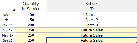 - The Quantity In-Service column indicates the number of units that are assumed to have started operating during each period. The general term in-service represents the closest estimate of the time at which each unit started operating in the field. For example, if you have access to both the manufacturing date and the shipping date for a group of parts, you may choose to perform the analysis based on the shipping date because it is a closer indicator of the time the product started operating in the field.