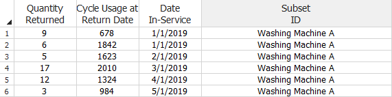 - The Usage at Return Date column indicates the amount usage the units accumulated before they were returned. In the following example, the usage unit is in terms of cycles.