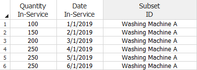 - The Quantity In-Service column is for entering the number of units that are assumed to have started operating during each period.