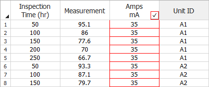 - Unit ID(s) - the specific test unit being measured, with separate columns for each test unit. (You can rename a column by right-clicking the column heading and choosing Rename Column on the shortcut menu.)