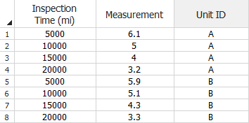 - Inspection Time - the time at which the degradation was measured. Time may also be measured as the amount of usage the unit accumulates or as the factor that degrades the unit.