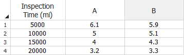 The following example shows a Weibull++ nondestructive degradation analysis for two automobile tires, A and B. The inspection time is in mileage because of its direct relation to the wear on the tires.