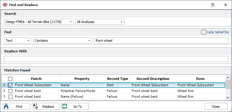 The following picture shows an example of the Find and Replace tool in XFMEA.