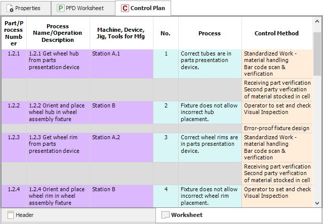 This topic describes how to enter data in the Worksheet tab. For a description of all columns that could be displayed in a Control Plan worksheet analysis, see Control Plan Worksheet Columns.
