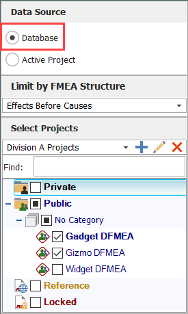- Database: With this option, you must firs specify an FMEA Structure. You can also use the same project filters that are available in many other locations throughout the ReliaSoft desktop applications. You can then select to query any or all of the projects in the current database that use the specified FMEA structure (i.e., grouped effects and causes, causes before effects, etc.) and that match the specified project filter, if one is used.