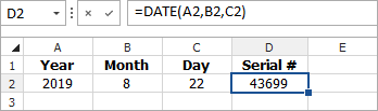- The DATE function uses the inputs of other cells to obtain the serial number. For example, if you have dates specified in three cells where A2=Year, B2=Month and C2=Day, =DATE(A2,B2,C2) returns the serial number for that date.