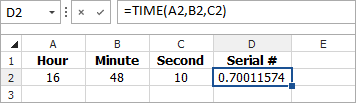- The TIME function uses the inputs of other cells to obtain the serial number. For example, if you have dates specified in three cells where A2=Hour, B2=Minute and C2=Second, =Time(A2,B2,C2) returns the serial number for that time.