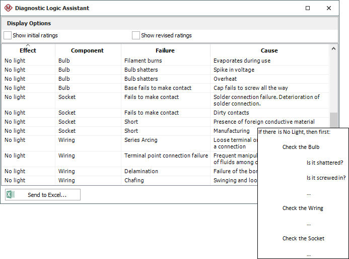 For example, the following picture in XFMEA shows fictional data from the FMEAs performed on the components of a chandelier, and the partial troubleshooting guide that might be developed based on the data for the "No light" effect.
