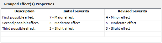- Grouped Effects and Causes - the properties window will be divided into two sections. In the table at the top of the window, you can enter a separate description and severity rating for each potential effect.