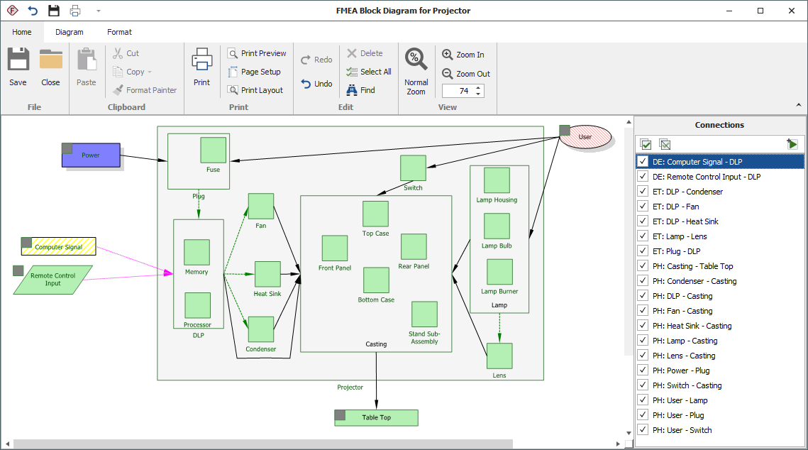 You can create an FMEA Block Diagram for any item in the system hierarchy that visually depicts the system assembly that will be analyzed in a Design FMEA. These diagrams help to define the scope of a particular analysis project and also may provide additional information that will be useful to the analysis team when they attempt to identify potential failure modes.