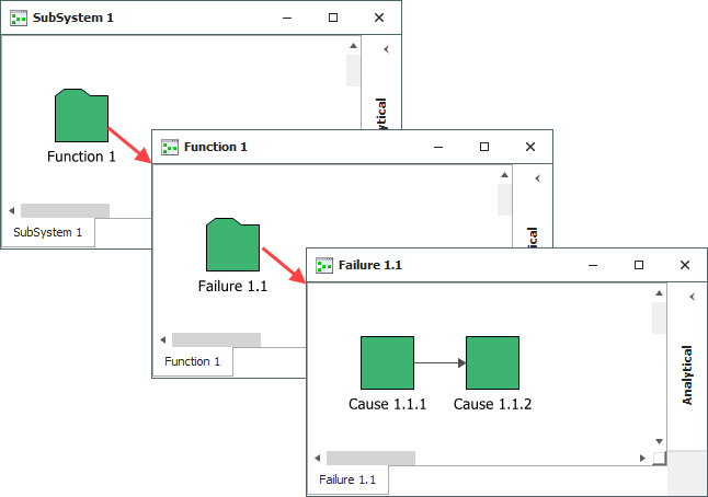 By default, the FMRA diagrams are created as . You can choose FMRA > Inheritance > Toggle Diagram Type to change them to , or to change simulation diagrams to analytical ones. This command changes all of the FMRA diagrams in the project; you cannot have both analytical and simulation FMRA diagrams in the same project.