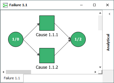 As you can see, the causes are assumed to be in a series configuration, as is the case with all reliability-wise configurations built in XFMEA/RCM++. Working with the FMRA in BlockSim allows you to change the reliability-wise configuration. For instance, let's imagine that the causes are actually in a parallel configuration—in other words, the item will not fail if only Cause 1.1.1 happens OR only Cause 1.1.2 occurs, but the item will fail if both occur. To represent this, you would change the Failure 1.1 diagram as follows (with the first node acting as a starter block):
