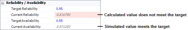 The FMRA in XFMEA/RCM++ applies automatic color-coding in the Properties tab of the Analysis Panel to highlight situations when the expected reliability/availability does not meet the specified targets. The highlights can be applied to the calculated/simulated values, and also to the cause occurrence ratings if applicable.
