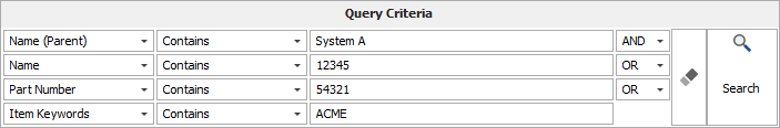 - Use the Query Criteria area to specify the keywords and/or phrases that you want to consider in the search. You can define up to four search terms, with the Boolean operators AND and OR. Refer toQuery Criteriabelow for more information.