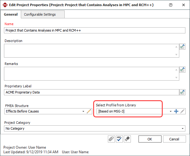 If you are working with RCM++ and you wish to see the MSI selection questions, failure effect categorization and task selection responses for the systems you import from MPC, make sure that the configurable project properties in RCM++ are consistent with the MSG-3 guidelines. The easiest way to do this is to open the Project Properties in RCM++ (Project > Management > Edit Project Properties) and check to make sure that the configurable settings are based on the MSG-3 profile from the default library installed with the software.