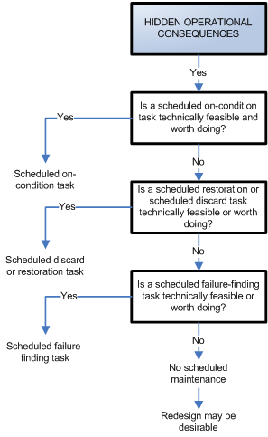 The RCM analysis team’s decision of which strategy (or strategies) to employ for each potential failure may be based on judgment/experience, a predefined logic diagram (often connected to the failure effect categorization), cost comparisons, or some combination of factors. To continue with the SAE JA1012 example introduced in Identify and Evaluate (Categorize) the Effects of Failure, the following picture shows the questions to be considered for failures with effects that have been categorized as "Hidden Operational." The full logic diagram also includes a separate set of questions for each of the other five categories.