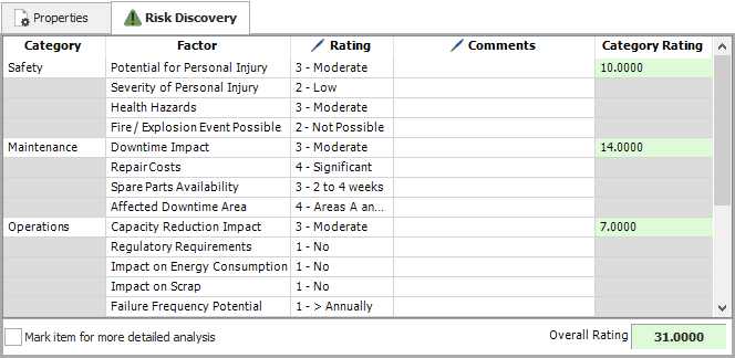 If the project is configured to use ratings for Risk Discovery analysis, you can assign ratings for a variety of different factors and then calculate an overall item criticality value for each item or piece of equipment.