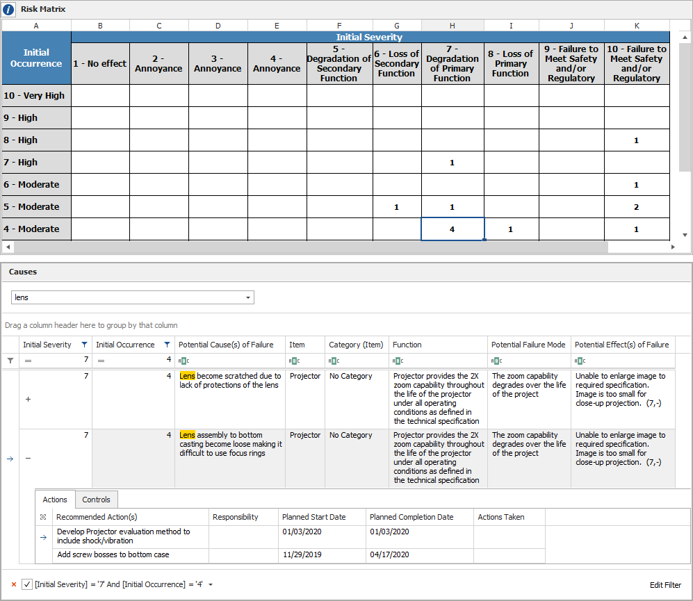In the example below, the panel shows a list of all the causes in all selected FMEAs where Si=7 and Oi=4, and the description contains the word "lens." Additionally, the controls and actions associated with one of these causes are displayed.