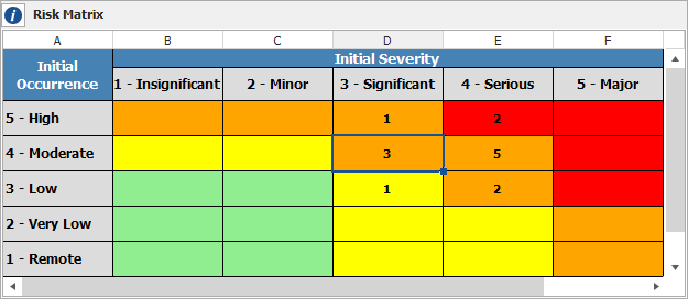 The Risk Matrix shows the quantity of FMEA causes, failure modes, effects or items for each combination of ratings.