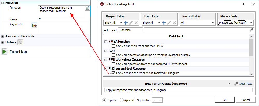 When you are using the utility in this way, the New Text Preview area shows how the selected text will appear, and provides information on how many characters out of the character limit are being used (e.g., 45 characters out of a possible 2000 in the example below). If you exceed the text field's character limit, your text will be truncated. - Create one or multiple new records - If you use one of the ribbon commands in an FMEA or P-Diagram (e.g., Functions > Select Existing Text), you can select multiple descriptions and the utility will use your selection(s) to create new record(s).