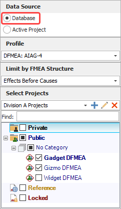 - Database: With this option, you must specify a Profile and, if more than one FMEA structure is used in the database, an FMEA Structure. You can also use the same project filters that are available in many other locations throughout the ReliaSoft desktop applications. You can then select to query any or all of the projects in the current database that use the specified FMEA structure (i.e., grouped effects and causes, causes before effects, etc.) and that match the specified project filter, if one is used. The criteria and results will use the property names from the selected profile.