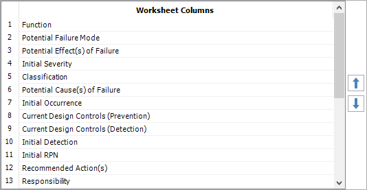For many of the analyses that use a worksheet (including FMEAs, PFD worksheets, DVP&Rs and DRBFMs), the Worksheet Columns page of the interface style allows you to specify the order in which the property columns will be displayed. These preferences will be saved with the project so the column order will be the same for all users who view the analysis.