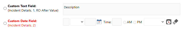 The options depend on the type of field (description, date, check box, etc.) and record (incident, problem, etc.). Some current settings appear in parentheses under the field name. In the following example, the "Custom Text Field" will display in the first detail field position in the "Incident Details" area of the Incident page, and it will be read-only after a value is entered. The "Custom Date Field" will display in the second portion of that area, and is required (red text).
