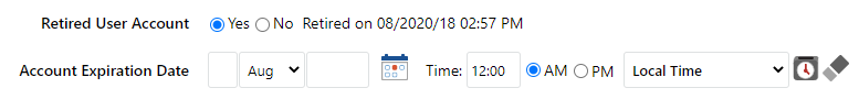 A user can be retired from a particular entity or from the entire XFRACAS website. In both cases, you can configure the account to be retired automatically on a certain date and time, or you can manually retire the account.